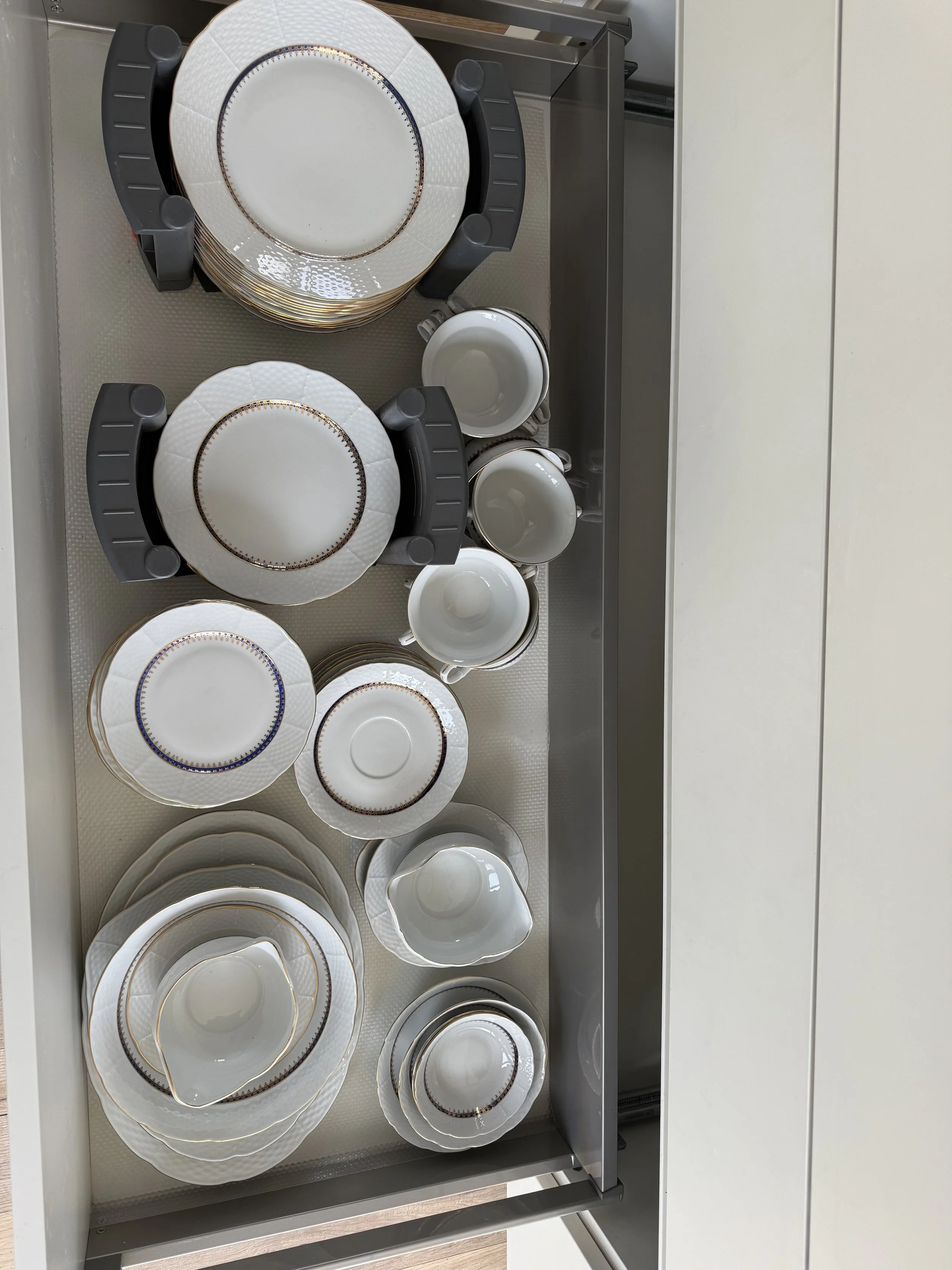 Stacked white ceramic dishes with decorative gold, blue, and red rims in a kitchen drawer, accompanied by matching cups and bowls.