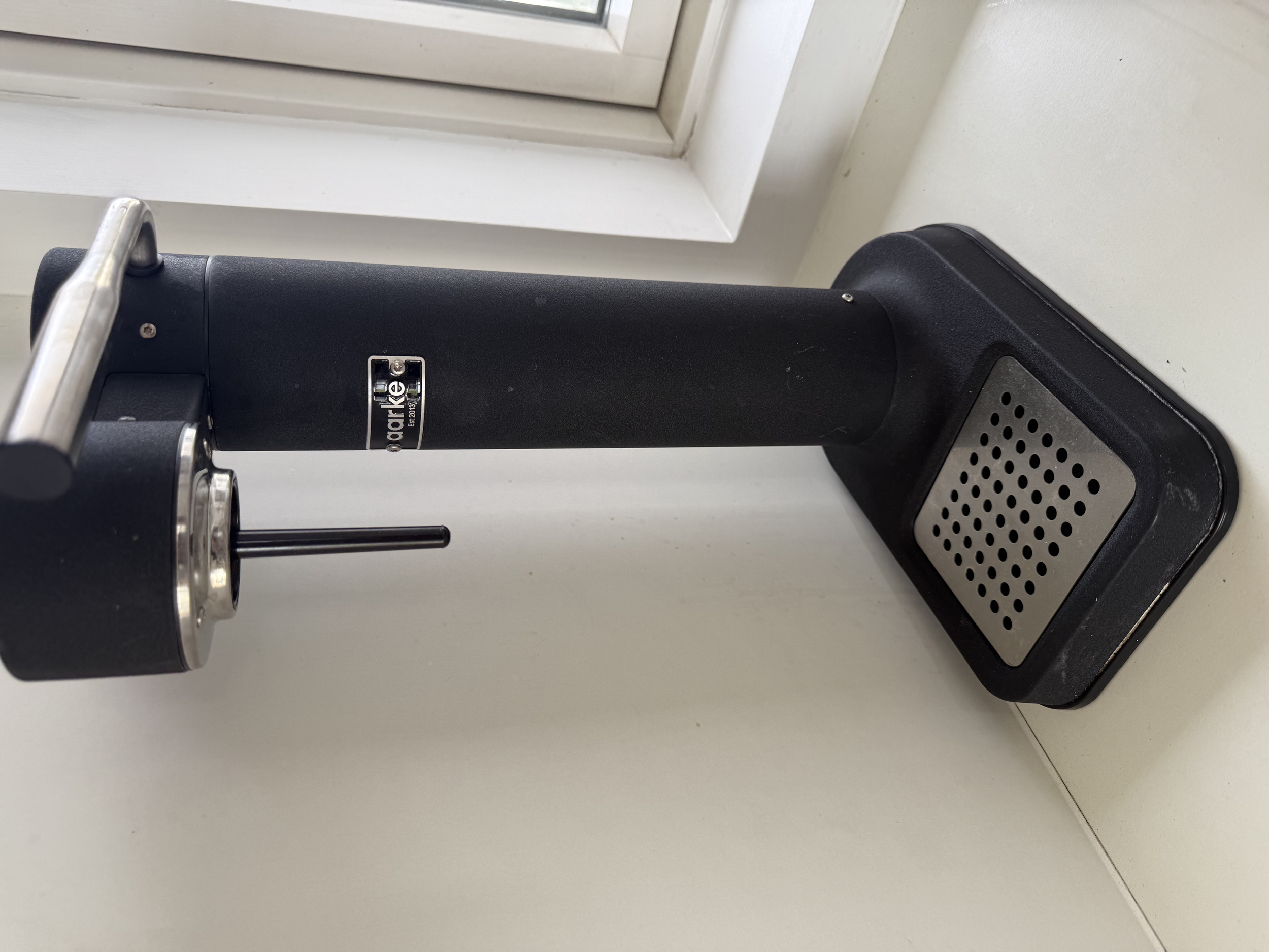 Black electronic scale with a metallic weighing platform, positioned on a white surface near a window.